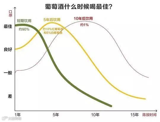 世界上90%以上的葡萄酒最佳适饮期都是在1-2年内,只有4%左右的优质葡萄酒才具有5至10年的陈年潜力,仅有1%的顶级葡萄酒才具有10年以上的陈年潜力。