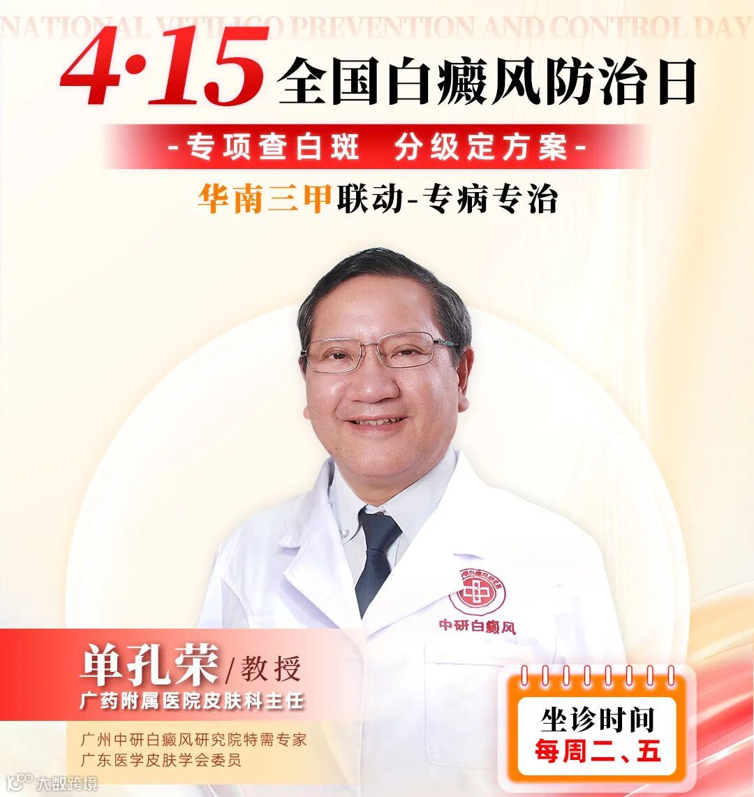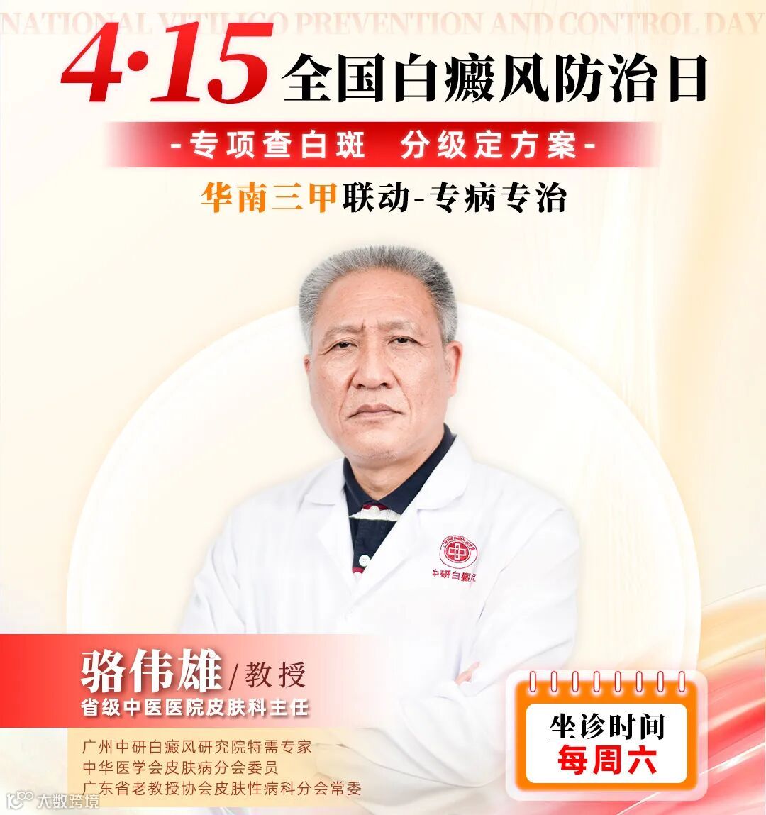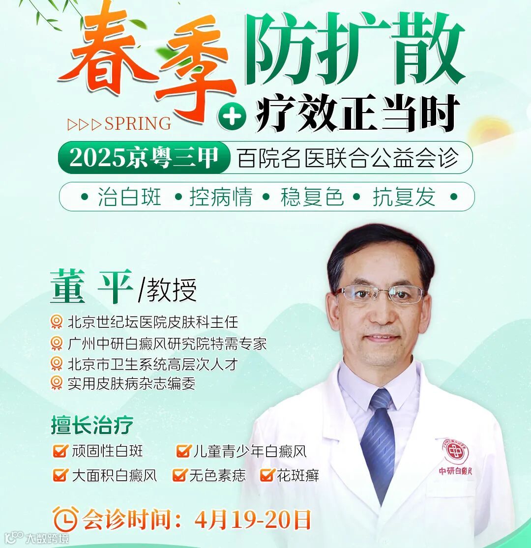 “4·15全国白癜风防治日”到来之际,我院发起“4·15全国白癜风防治日——专项查白斑·分级定方案”公益活动,三甲名医多对一联诊,提高大众对“白癜风”的认识,拒绝歧视、规避盲诊盲治,引导白斑患者早筛查早诊治,让患者在盛夏来临前构筑健康防线。