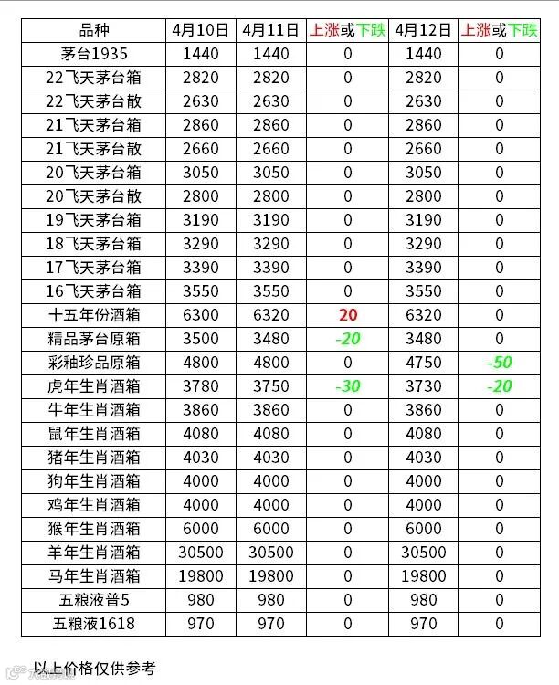 今日(4月12日),从网络发布的白酒价格行情监测数据显示,这几天茅台几款酒的售价下跌中。