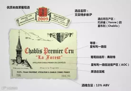 但是,我们可以根据产区来推断这瓶酒的酿酒品种。假设酒标上出现的产区的是勃艮第夏布利(Chablis),可以推断出这瓶白葡萄酒是由霞多丽(Chardonnay)酿制。因此,当你拿到一瓶法国葡萄酒的时候,除了酒庄,产区也是一条重要线索。