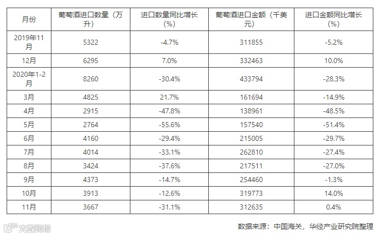 近一年中国葡萄酒进口情况统计表