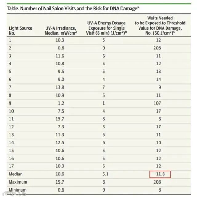 如果按美甲一次照灯8分钟计算,平均做11.8次美甲就会产生 DNA 损伤。
