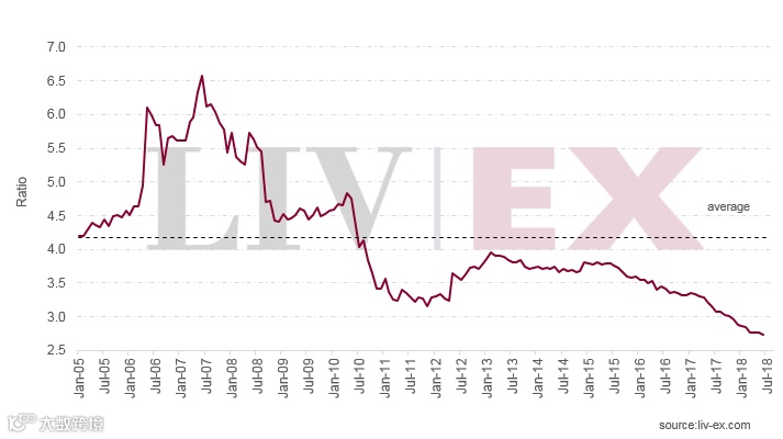 最新的英国伦敦葡萄酒交易所(Liv-ex)精品酒指数显示,波尔多一级酒庄的主牌和副牌葡萄酒之间的价格比率进一步走低。去年8月,波尔多一级酒庄的主牌和副牌葡萄酒之间的价格比率(把优质葡萄酒50指数的葡萄酒总价格除以副牌葡萄酒50指数的葡萄酒总价格而计算得出)就跌破了之前2011年12月时3.15的最低纪录。如今,这一比率进一步下降。