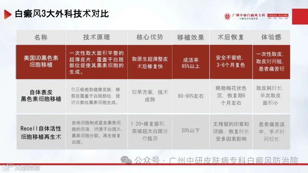 周舒教授在提及白癜风新型治疗技术时,讲解到《美国UD黑色素细胞移植》技术,该移植技术对比现有的“自体表皮黑色素细胞移植术”、“Recell自体活性细胞移植”,无论从‘核心优势-移植效果-术后恢复-体验感’等方面,都有难以比拟的优越性。是白癜风治疗领域的一项新的技术突破,大大缩短白癜风患者的治疗周期,为白癜风患者带来治疗新选择。