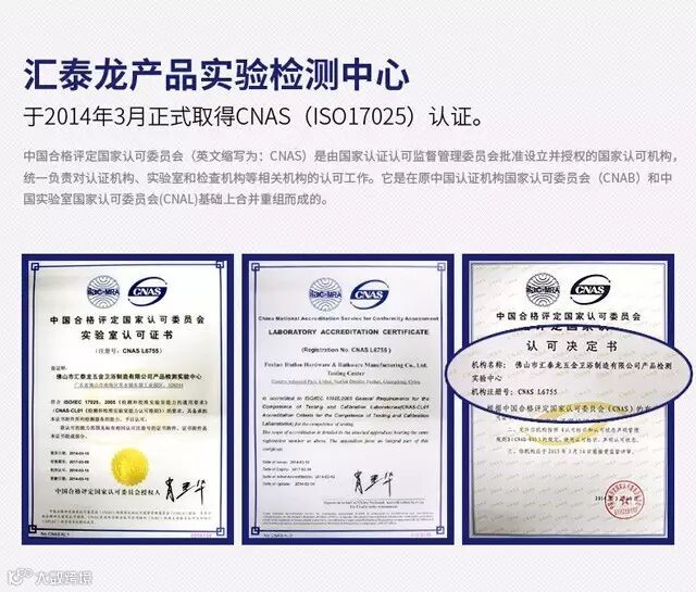汇泰龙对于产品品质十分重视,拥有国家级CNAS权威认证的汇泰龙产品检测中心,配备有国际领先的锁具寿命测试仪、地弹簧寿命测试仪、盐雾测试器、智能锁老化测试仪等检测设备,产品品质检测权威且可靠,值得信赖。