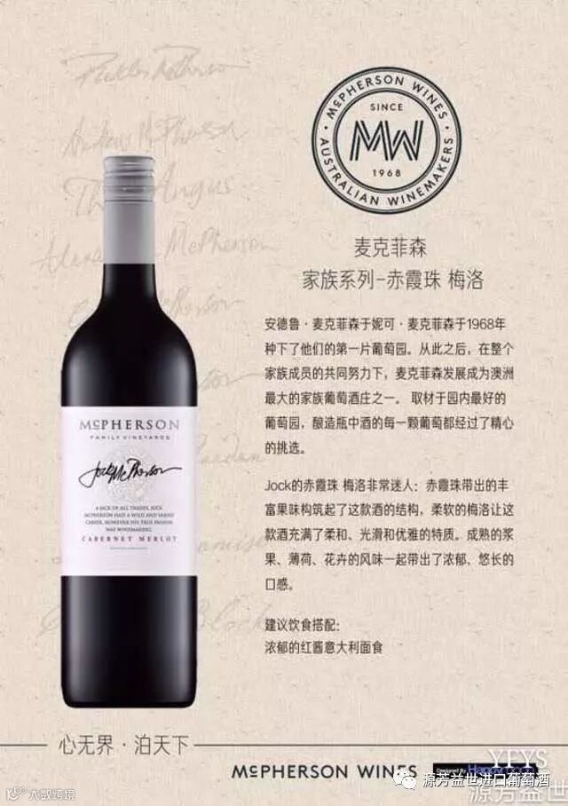 这款麦克菲森红葡萄酒是赤霞珠与梅洛的完美结合。赤霞珠带出的丰富果味构筑起了这款酒的结构,柔软的梅洛让这款酒充满了柔和、光滑和优雅的特质。成熟的浆果、薄荷、花卉的风味一起带出了浓郁悠长的口感。适合搭配浓郁的意大利面食,烤肉。