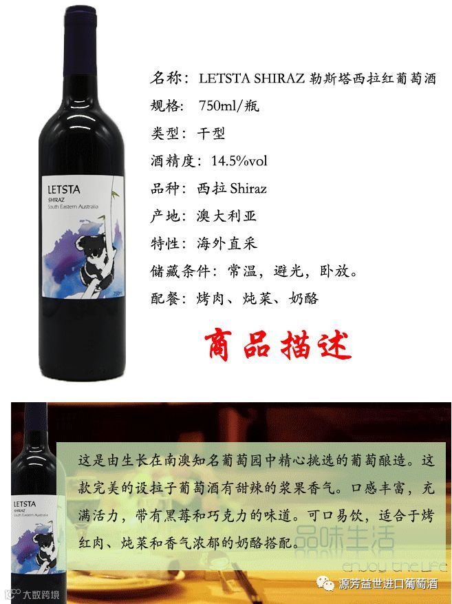 品酒师推荐:勒斯塔西拉红葡萄酒这是由生长在南澳知名葡萄园中精心挑选的葡萄酿造。有着甜辣的浆果香气。可口易饮,适合于烤肉、炖菜和香气浓郁的奶酪搭配。