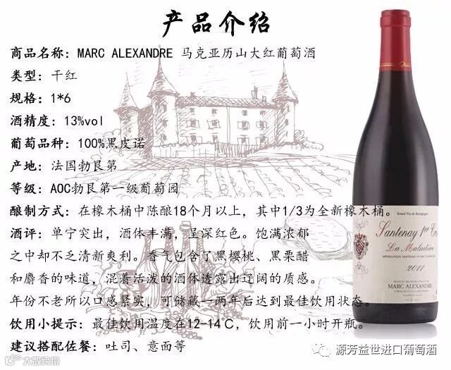 品酒师推荐:马克亚历山大红葡萄酒酒体丰满呈深红色,单宁突出,饱满浓郁之中却又不乏清新爽利。香气包含了黑樱桃、黑醋栗和麝香的味道,混着活泼的酒体透露出辽阔的质感。建议搭配佐餐吐司、意面等。