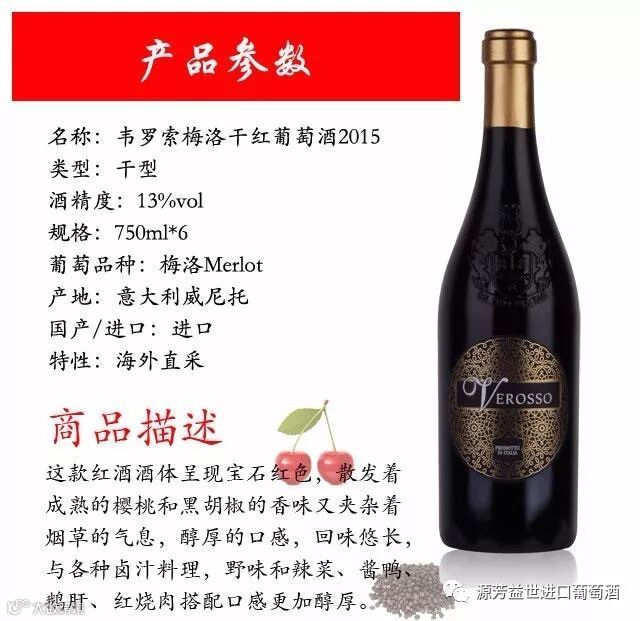 品酒师推荐:韦罗索梅洛干红葡萄酒的酒体呈宝石红色,散发着成熟樱桃和黑胡椒的香味又夹杂着烟草的气息,醇厚的口感,回味悠长,与各种卤汁料理、野味、辣菜、鹅肝、红烧肉搭配口感更佳醇厚。