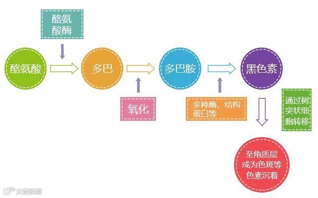 酪氨酸、酪氨酸酶在一定作用下形成多巴,多巴氧化形成多巴醌,再经过一系列复杂的过程合成黑色素。
