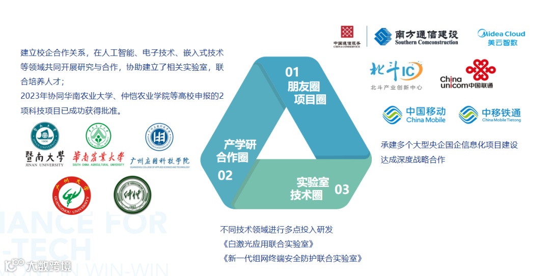 新产研生态。在产学研深入融合的实践中,光机电科技公司先后与暨南大学、华南农业大学、三大运营商、中国通信服务等30余家高校、科研院所、央国企龙头企业等达成深度合作,牵头产业链上下游单位共建白激光应用联合实验室、新一代组网终端安全防护联合实验室,不断拓展项目朋友圈、产学研合作圈和实验室技术圈,成为行业领域活跃节点,共同促进资源共享、技术互补,行业合作共赢。