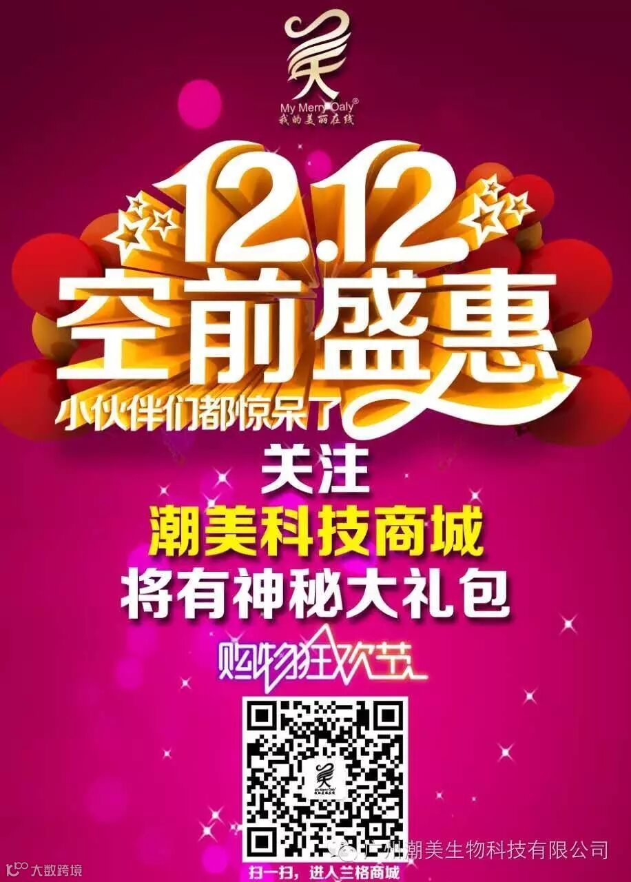 双十一已成为历史,双十二才是经典!服务不会因价格改变,质量不会因活动缩水! 伴随着又一个“非传统”购物狂欢节的到来,广州潮美生物科技有了公司 ,为了答谢新老顾客公司决定让利百万!