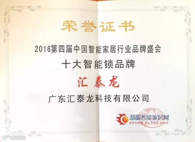 2016年度十大最受天猫消费者欢迎智能锁品牌的评选,主要考核产品的用户体验、销量等关键指标,同时综合品牌知名度与美誉度多方面考虑。汇泰龙智能锁凭借优秀的产品品质、人性化的功能体验深受消费者喜爱,一经上线,便在天猫商城迅速引爆抢购热潮。阿里巴巴与天猫美家经过调查和考核后为汇泰龙联合颁发此奖项。
