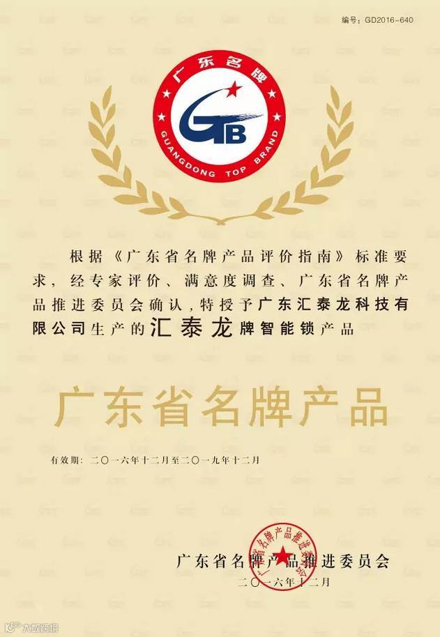 汇泰龙智能锁获评广东省名牌产品,这是政府职能部门及广大消费者对汇泰龙产品质量的高度评价,也是对汇泰龙公司的产品质量和品牌建设的充分肯定。