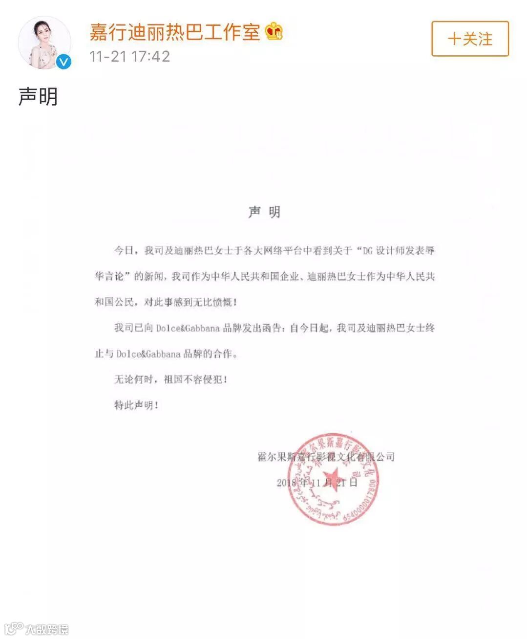 “我司作为中华人民共和国企业,迪丽热巴女士作为中华人民共和国公民,对此事感到无比愤慨!已向Dolce & Gabbana品牌方发出函告:自今日起,我司迪丽热巴女士终止与Dolce & Gabbana品牌合作”。此前迪丽热巴担任杜嘉班纳亚太地区品牌大使。