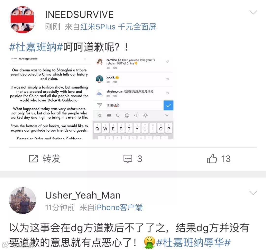 “中午大概11点左右,我们正在彩排,这时我看到一个博主发了一条微博,称意大利奢侈品牌D&G的品牌创始人兼创意总监 Stefano Gabbana 发表辱华言论的微博,我立刻就告诉了身边的朋友。”王涵回忆,那时所有模特正在彩排谢幕,“过不了多久,周围的模特们都纷纷开始议论起了这个事情。”