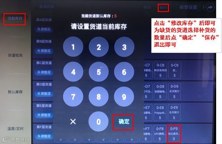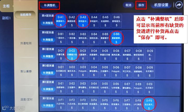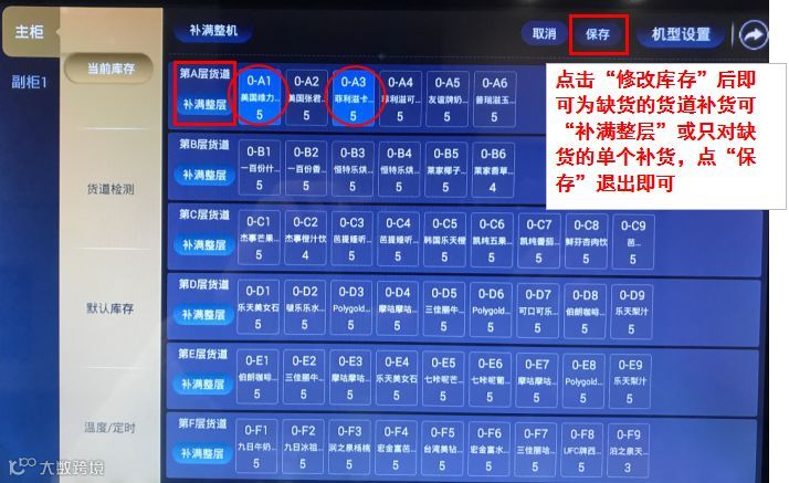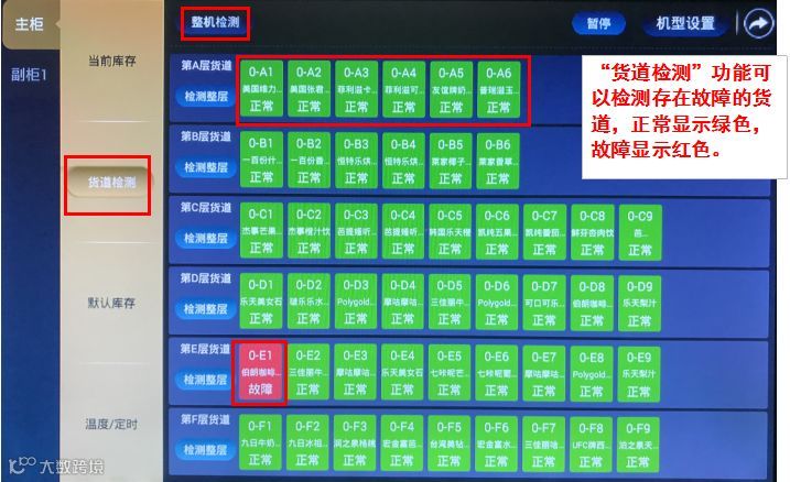 4、在后台面板系统设置里进行货道检测(连续按2次),如未正常掉下商品,则重新调整货道弹簧。