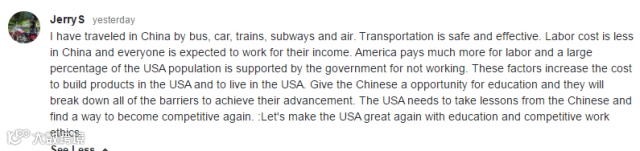 我在中国旅行,坐过巴士、小轿车、火车、地铁、飞机等等所有交通工具。中国的交通安全而且高效,在中国人力成本很低,而且每个人都希望通过自己的工作和努力赚取收入。但在美国不同,美国人力成本太高,而且美国政府供养了大量不去工作的人,这就大大抬高了同样的工程在美国的建造成本。如果给予中国人更多的教育机会,他们就能够打破所有挡在他们目标前的障碍。美国应当从中国那里学习经验,才能恢复竞争力。美国的强大需要教育以更有效的工作观念。