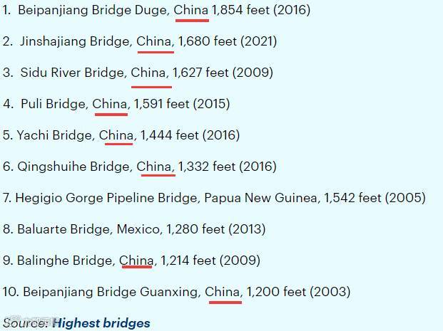 事实上,在10座世界最高的大桥名单当中,除了第七(位于巴布亚新几内亚)和第八(位于墨西哥)外,其余八座桥梁都来自中国!