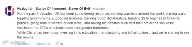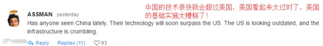 同样的,美国人当中也不乏“愤青”。其中有人评价道:过去的30多年间,美国忙于在全球打仗,支持恐怖主义,为“跟随美国”的政权撒钱,忙于争论是否该有性病疫苗,忙于争论学校是否该有男女混用卫生间。这时候中国在干嘛?他们忙于投资自己的教育、制造业和基础设施。