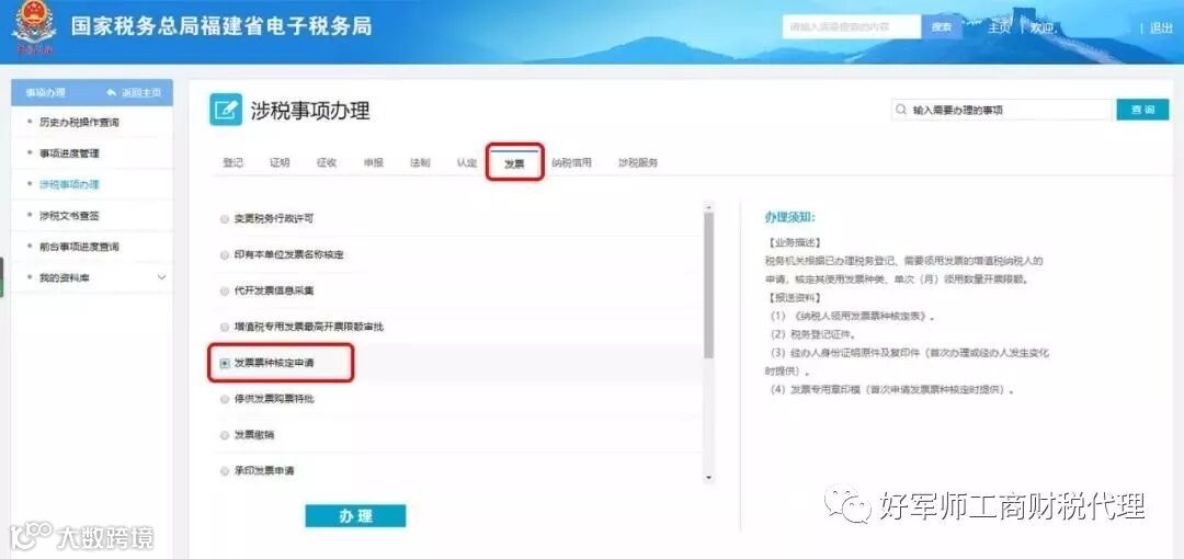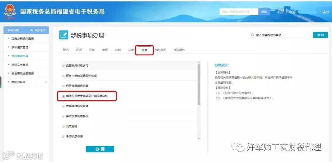 待审核通过后,返回“涉税事项办理”,依旧选择“发票”,再点击“增值税专用发票最高开票限额审批”。