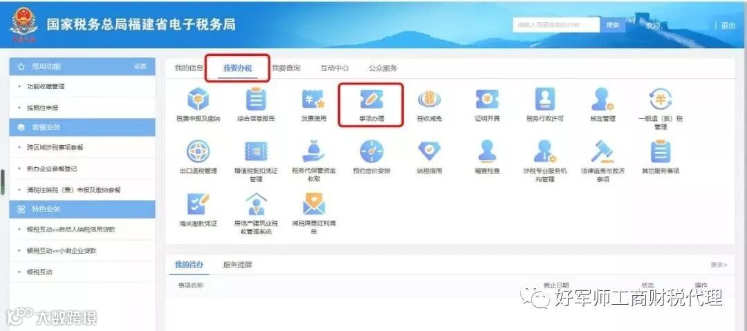 登录后,点击“我要办税”,再选择“事项办理”。