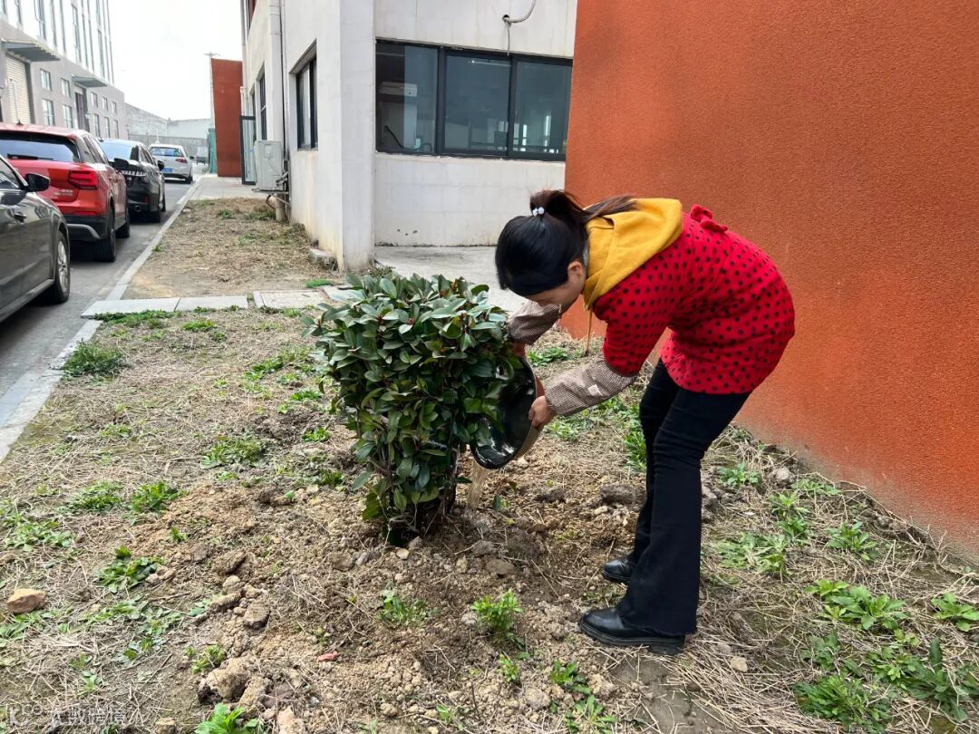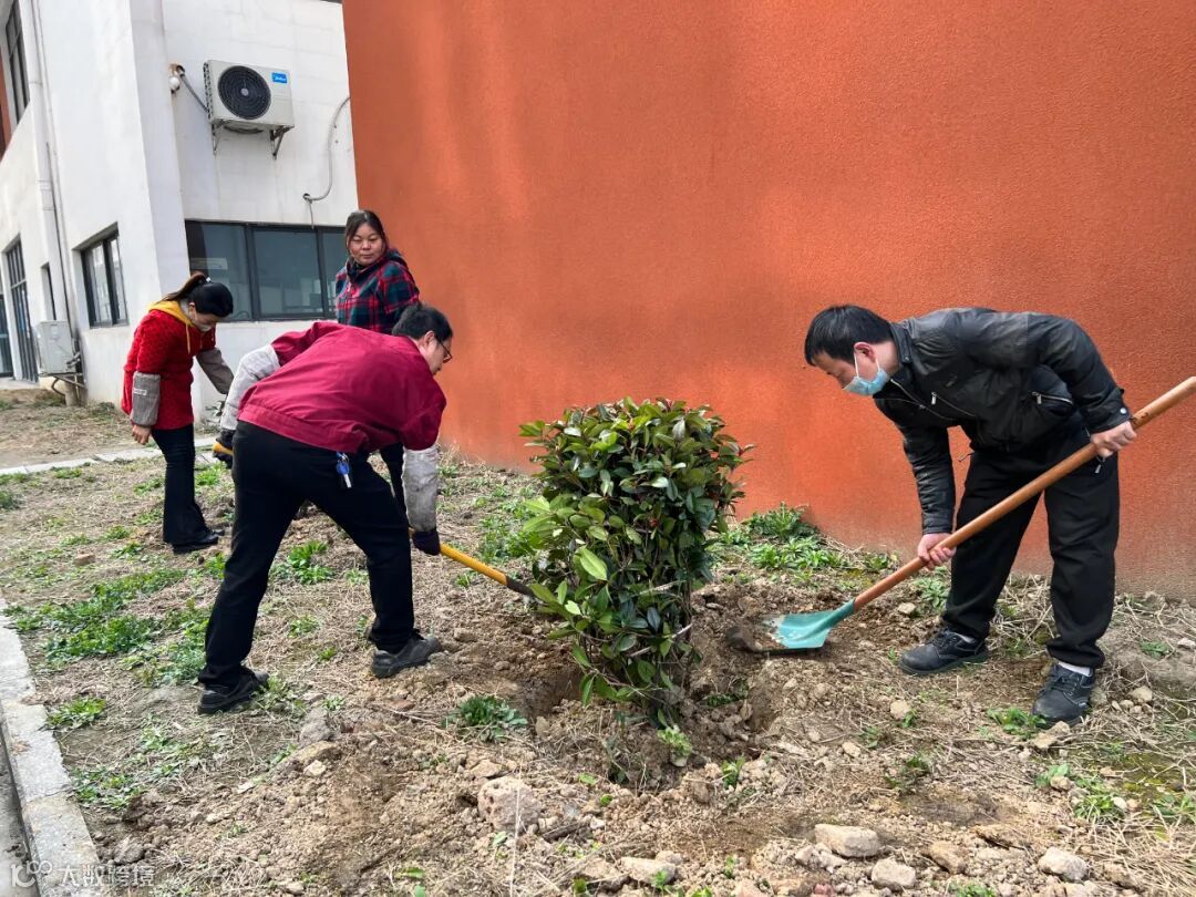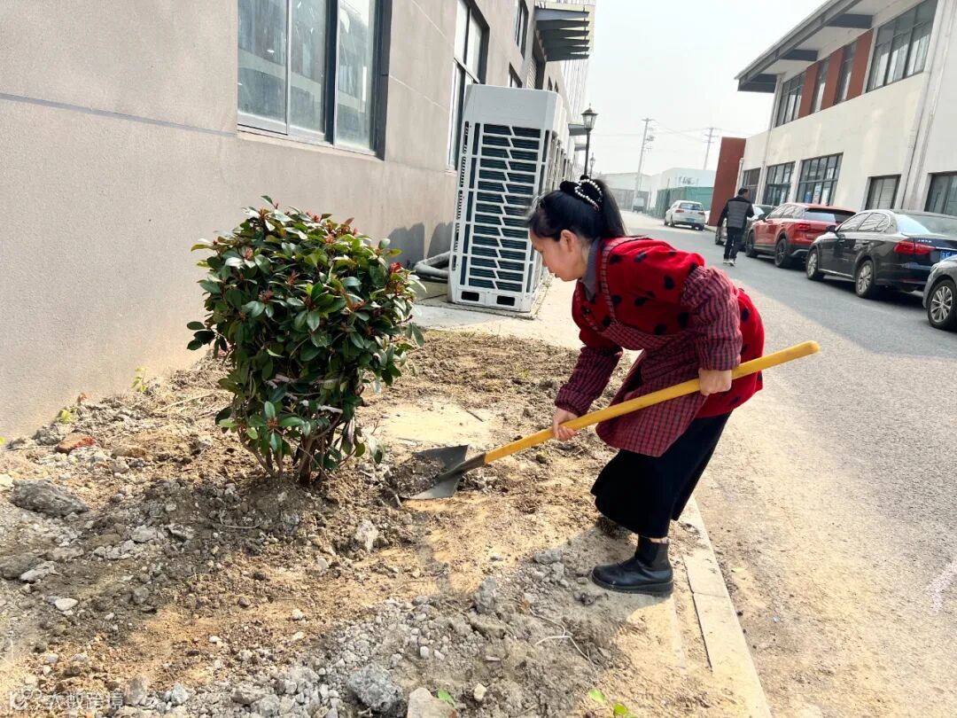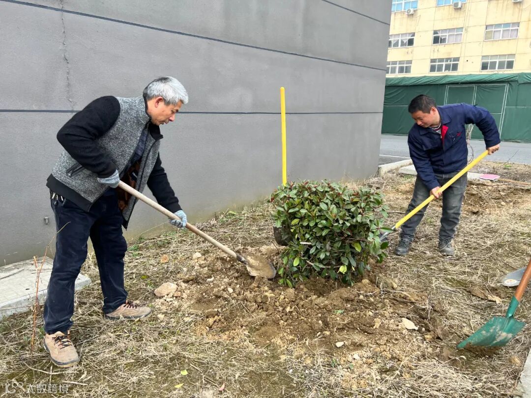 植树现场,大家拿起铁锹、挥动锄头,干劲十足;有的挥锹铲土,有的扶树填土,有的培土浇水各个环节衔接有序,配合默契,一片忙碌欢快的景象。转眼间,20棵海棠、石楠树在厂区里 “安家落户”错落有致,挺拔可爱。