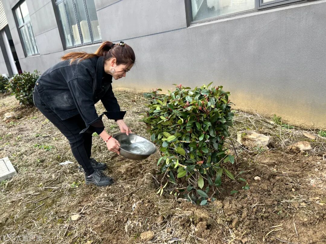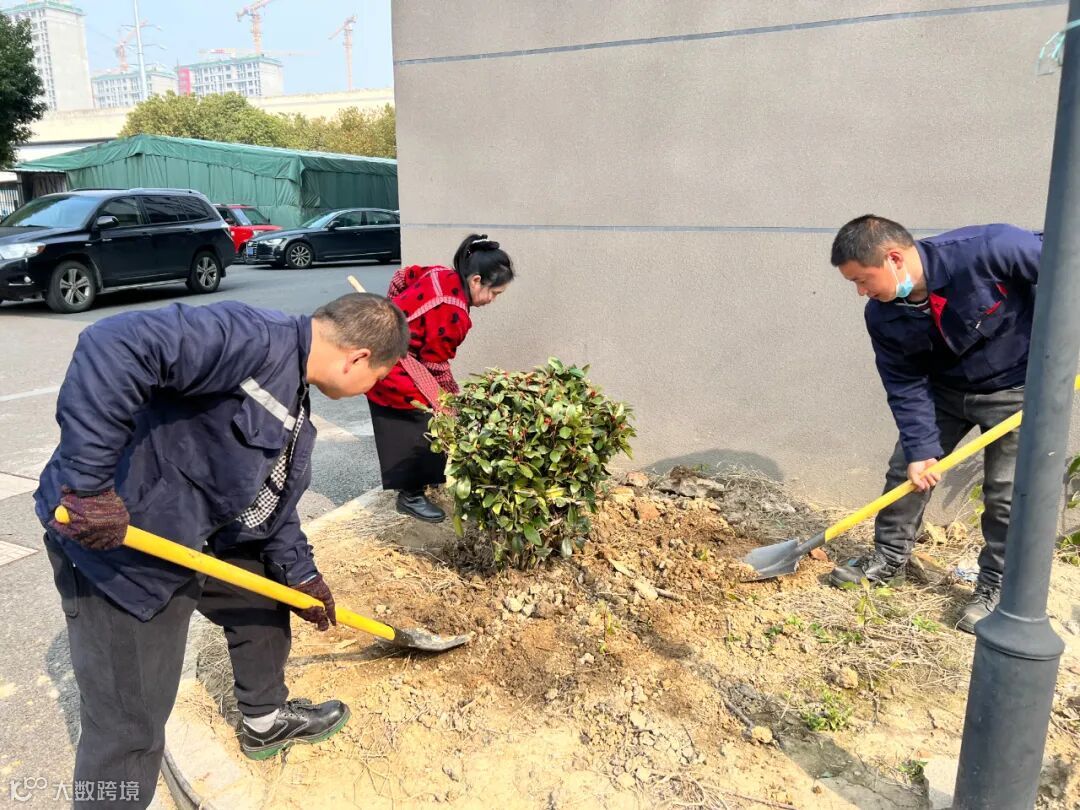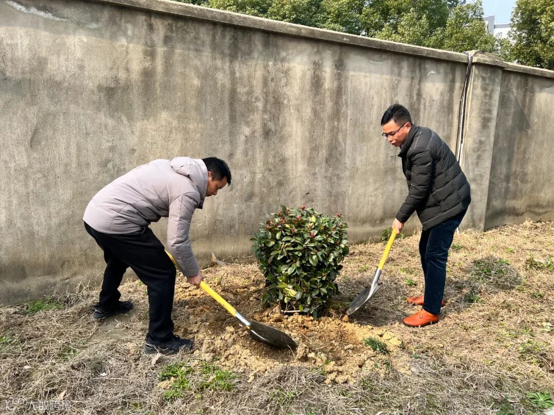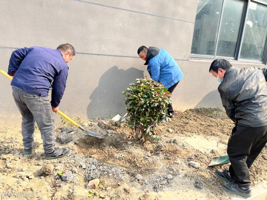 植树现场,大家拿起铁锹、挥动锄头,干劲十足;有的挥锹铲土,有的扶树填土,有的培土浇水各个环节衔接有序,配合默契,一片忙碌欢快的景象。转眼间,20棵海棠、石楠树在厂区里 “安家落户”错落有致,挺拔可爱。