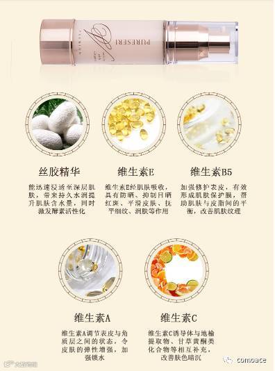 作为一支提拉紧致的精华液,除了核心珍贵成分的丝胶精华外,还添加维生素A、维生素B5、维生素C、维生素E等美容营养成分,具有抗皱、紧致、改善暗沉等多重功效,真是一款肌肤“爱吃”的精华液哟!