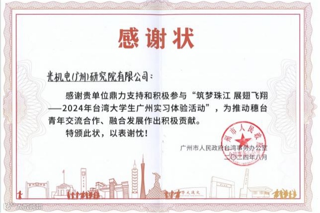 本次活动,光机电获得来自广州市台办的感谢状,以表彰光机电在推动穗台青年交流合作、融合发展作出积极贡献。