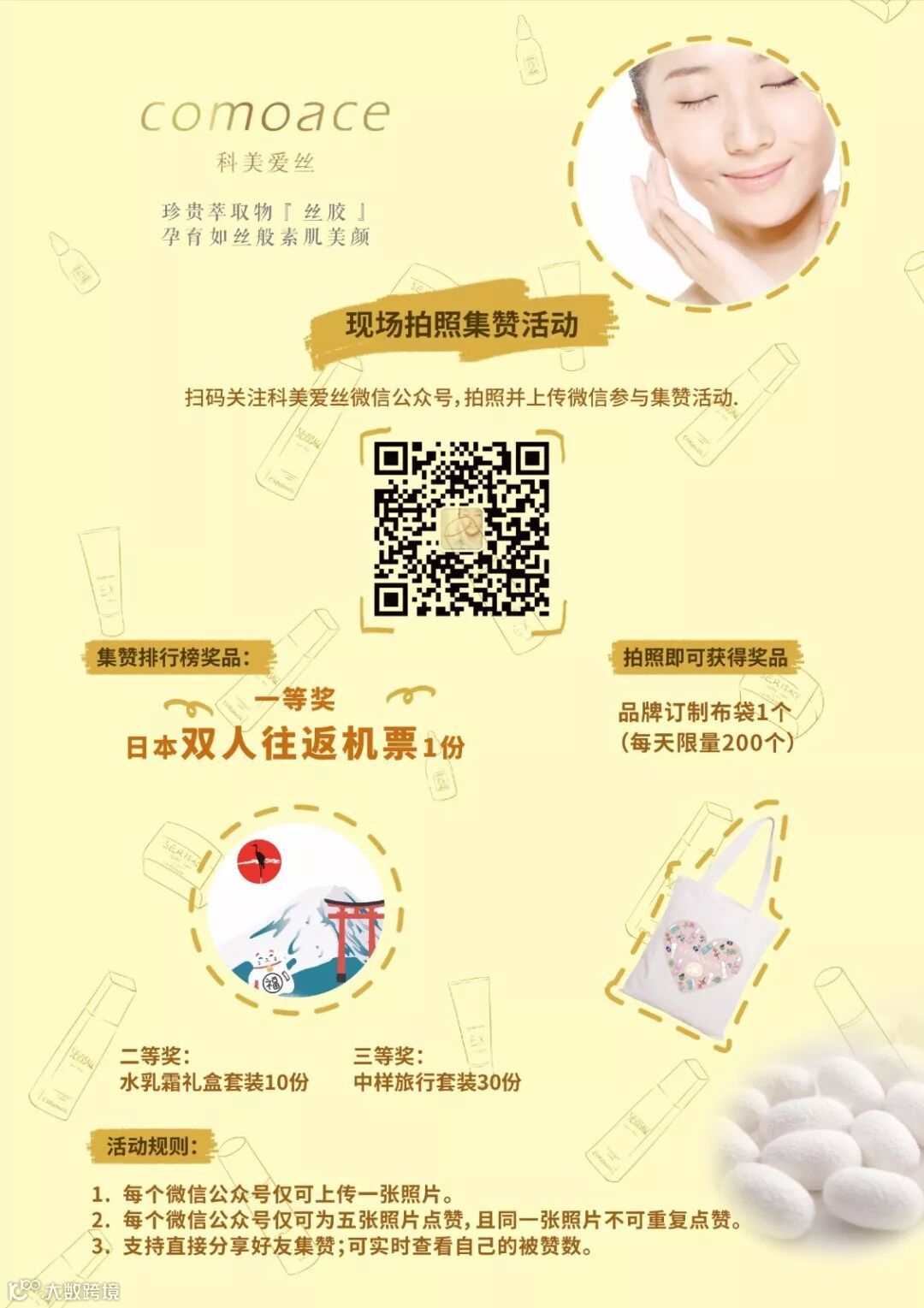 4月15日~21日,comoace在上海美罗城B1活动中庭开启为期一周的快闪店,预约即可免费进行肤质检测、产品体验,现场美妆博主在线直播互动,扫码就有礼品赠送,更有重头戏,拍照集赞赢取日本双人往返机票, 礼品超惊喜诱人哦!
