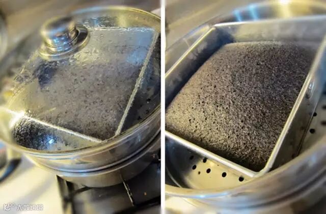 将面团切成小块后,放到煮沸的蒸笼中,蒸30分钟就可以了,也可以像图中一样,将整个做好的面团放进做蛋糕的盘子中,熟了之后再切块。好吃的黑米糕就做好啦!