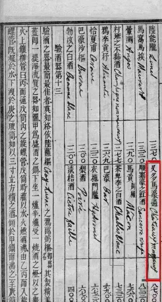早在光绪二十三年刊印的《葡萄酒谱》,已经出现了玛歌酒庄,当时的中文译名为“叉多马濠过”——“叉多”即Chateau,“马濠过”即Margaux。经玛歌酒庄中国区业务发展经理郑方园女士确认,“叉多马濠过”相当接近玛歌酒庄的法语读音。