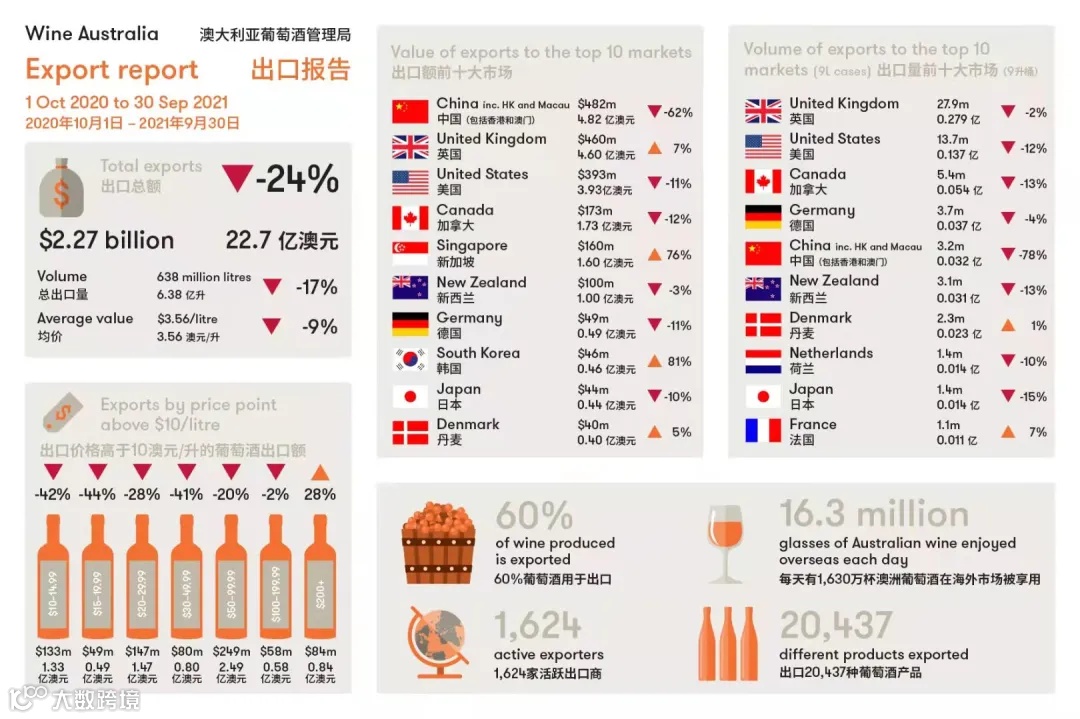 近日,澳大利亚葡萄酒管理局发布最新出口报告,在至今年9月的一年内,澳大利亚葡萄酒出口额下降24%至22.7亿澳元,出口量下降17%至6.38亿升。此外,葡萄酒的平均价格下跌9%,至每升3.56澳元。