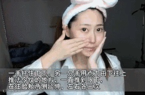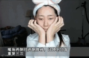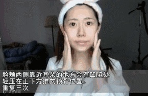 嘴角两侧往脸颊两侧推,延伸到锁骨位置,重复三次