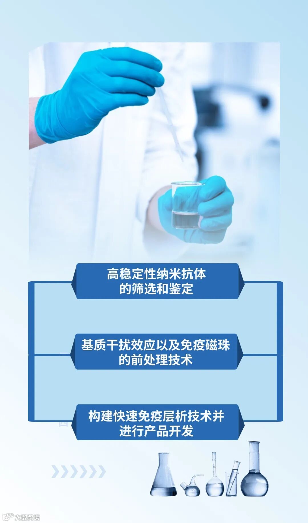 为推进项目的顺利开展,项目组将进行多方面的研究,包含高稳定性纳米抗体的淘筛及鉴定、基质干扰效应及免疫磁珠前处理技术研究以及快速免疫层析技术构建及产品开发等方面。