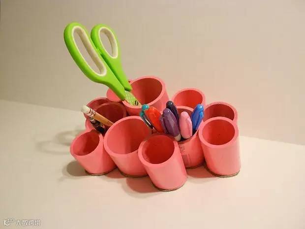 把大小不一的PVC管组合在一起,当笔筒的时候可以稍微倾斜一下,还可以摆放一些小玩具、剪刀、指甲钳等经常用到的小物件,需要用的时候再也不用到处找了!