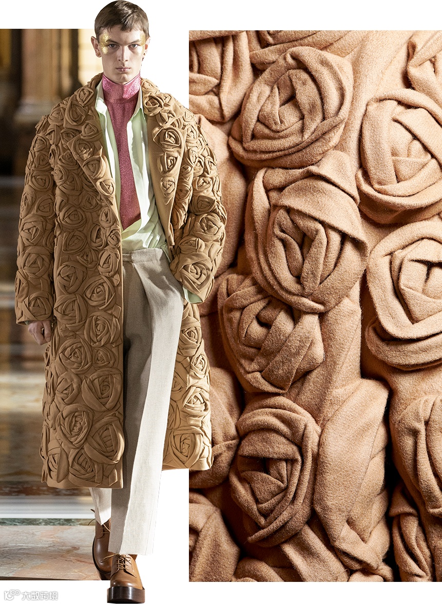 这件玫瑰花羊绒大衣一看就不简单,它是由 Atelier 工作室匠人用 250 朵玫瑰缝制而成。光是为这些玫瑰修边,就用了 280 米的羊绒面料。▼