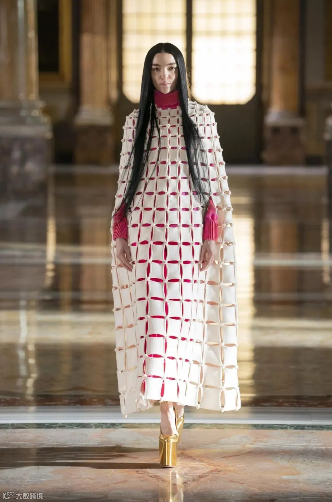 开场由意大利超模 Mariacarla Boscono 演绎的象牙色镂空设计斗篷,它花费了约 2000 米面料,裁成将近 500 个方块手工拼接而成。▼