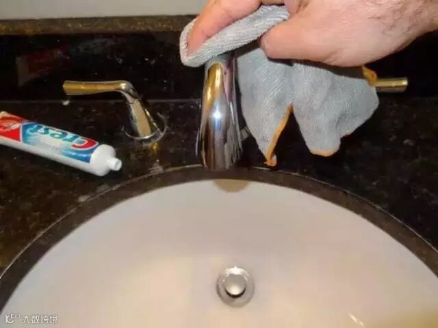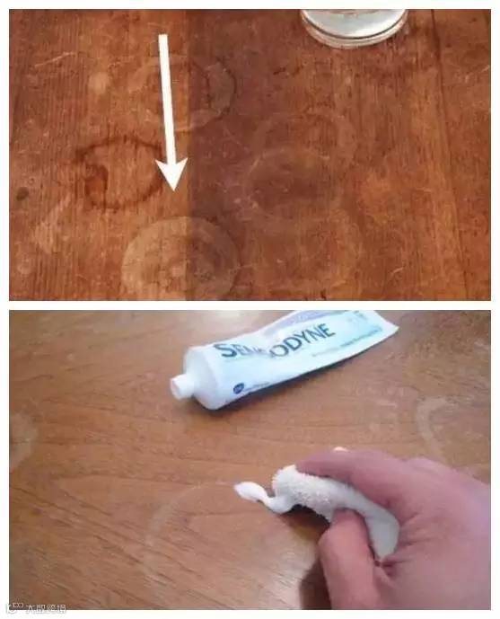 是不是常常擦了又擦,却发现水渍还是一直在那里?用牙膏一清理就消失了!(咖啡渍也可用同样的方法哦)