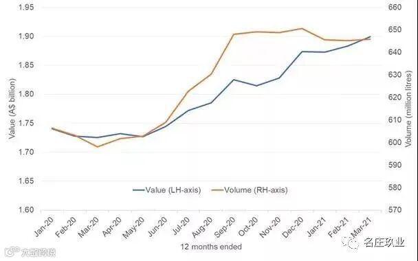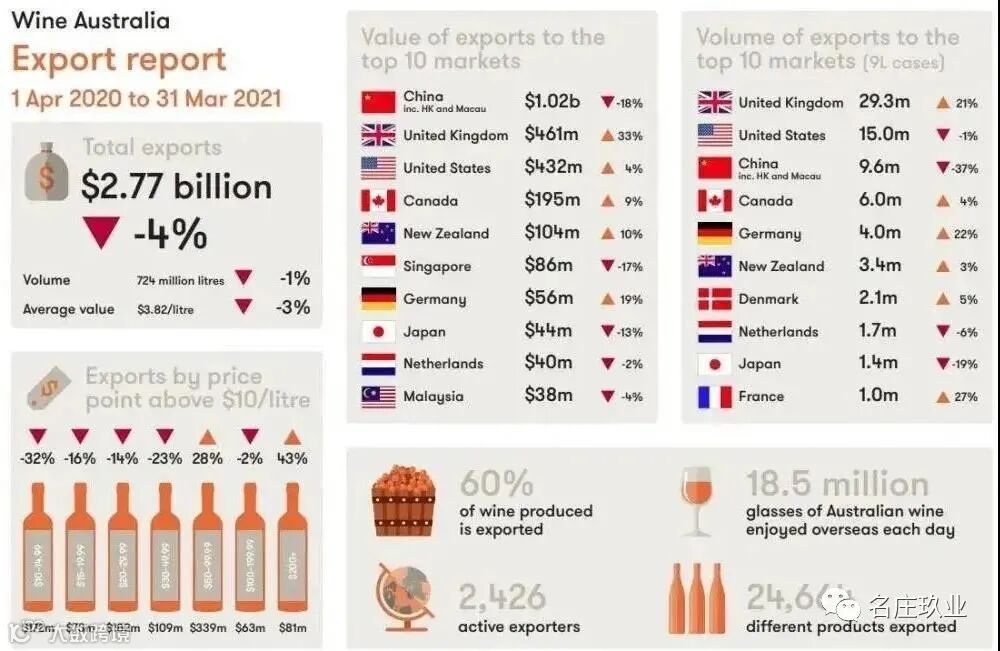 自我国对澳大利亚进口葡萄酒征收反倾销税以来,澳大利亚葡萄酒出口额暴跌。根据澳大利亚葡萄酒最新的出口报告,截至2021年3月的12个月中,澳大利亚葡萄酒出口额同比下降4%,至27.7亿澳元,主要是由于中国关税惩罚。