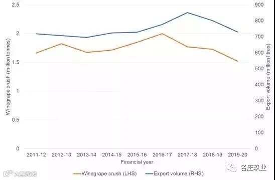 图1:2011-2020澳大利亚葡萄酒酿造及出口量变化