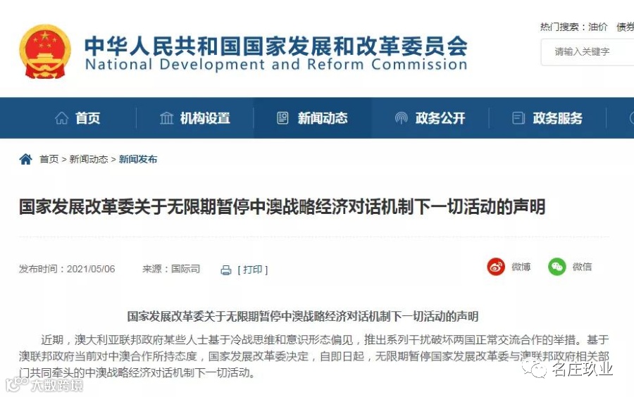 5月6日,国家发改委官网发布关于无限期暂停中澳战略经济对话机制下一切活动的声明。声明如下: