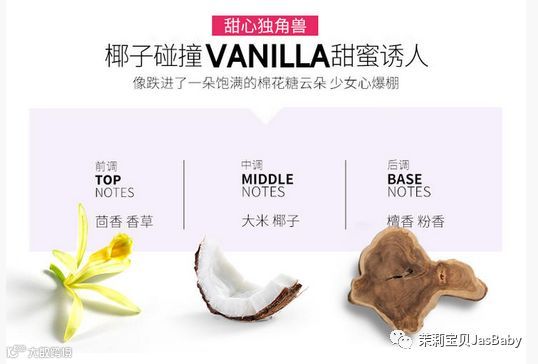 甜心独角兽裹含着如棉花糖般的奶香气息。前调是清新的茴香和甜甜的香草气息,仿佛行走在春风拂煦,蝴蝶环绕的花园里,扑面而来的是清新甜味的茴香。起初有一些清冷,但很快就变的温暖起来,甜甜的香草气息悄悄的钻出来,再慢慢的被温和的椰子奶香覆盖,最后是檀香木的优雅粉香气息。