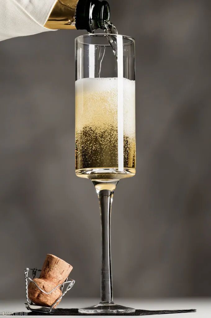 因香槟酒本身是白葡萄酒,所不同的是发泡,所以,饮用香槟也使用葡萄酒杯器型的玻璃酒杯,只是比葡萄酒杯的整体更趋于流线型,杯身细长,状似郁金香花,杯口收口小而杯肚大。