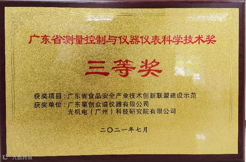 近日,我司与广东星创众谱仪器有限公司联合开展的科研项目《广东省食品安全产业技术创新联盟建设示范》经广东省测量控制技术与装备应用促进会及广东省计量测试学会评定,获得了“广东省测量控制与仪器仪表科学技术奖”三等奖。项目研究食品安全领域的检测技术,建立健全的创新联盟管理机制,形成了丰富的知识产权和一系列仪器产品,并进行推广和示范应用。