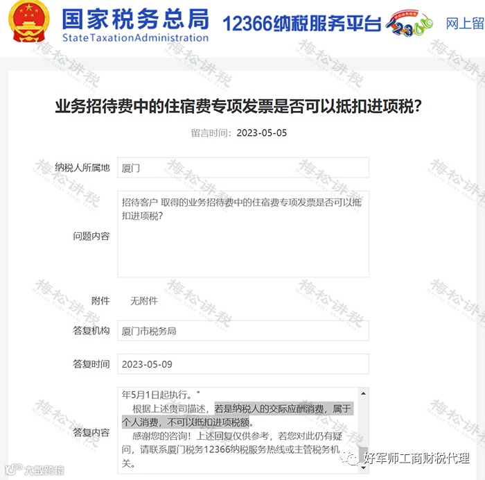 比如,A公司聘请B公司的员工维修一项机器设备,B公司员工因此产生的住宿费用由A公司负责,该项费用企业列入业务招待费,此时的住宿费非交际应酬性消费而属于生产性支出,可以抵扣进项税。