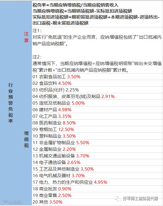 二、企业增值税行业预警税负率增值税税负率是指增值税纳税义务人当期应纳增值税占当期应税销售收入的比例。具体计算如下:税负率=当期应纳增值税/当期应税销售收入*100%当期应纳增值税=当期销项税额-实际抵扣进项税额实际抵扣进项税额=期初留抵进项税额+本期进项税额-进项转出-出口退税-期末留抵进项税额举个例子老王在县城里开办了一个商贸公司,为增值税一般纳税人,本期销售收入1000万,供应商也均为一般纳税人,采购成本600万元,其他成本共计208万,不考虑其他影响因素。以此来计算老王的公司税负。增值税税负:计算公式为(销项-进项)/收入或者可以做一个变形,(销项税率*收入-进项税率*成本)/收入=销项税率-进项税率*成本率由于进销项均为一般纳税人,税负率相同,因此实际负担的增值税为1000*13%-600*13%=52万,税负率=5.2%,用变形后的公式计算也是一样,13%-60%*13%=5.2%。其实,在现实中,可能并不是所有的采购都能够取得进项票,并且也并不是所有的供应商都是一般纳税人,能够提供13%的税票。很有可能提供的是3%的税票或者购买了一些服务,提供的是6%的税票,这种情况下,企业的增值税税负还会更高。因此,实际的税负可能受多重因素的影响。所得税税负:先计算企业的所得。可以通过一个简单的利润表来帮助理解。