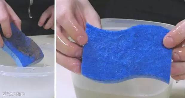 ▼10. 海绵要是刷过烧焦物或是酱汁,难免会染色,只要倒入两杯热水和两汤匙的盐搅拌,放一个晚上再拿起来就变成新的海绵。