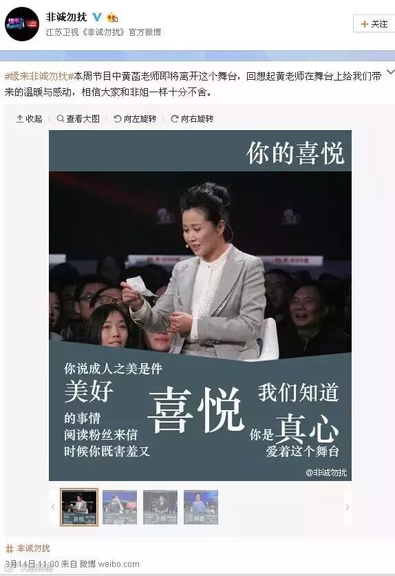 “黄菡老师陪这个节目走了6年,这是黄菡老师录制的最后一期。最后要说两句。”孟非说,“对于非诚勿扰这六年,我和我所有的同事要说的一个词就是感谢。对于你离开非诚勿扰之后,我们所有的话就是祝福。”
